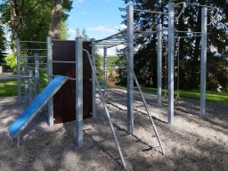 Zur Ausstattung gehören unter anderem Klimmzugstangen, Dip-Bars, Hangel-Elemente sowie Stationen für Knie- und Beinheben. Ergänzt wird der Bereich durch eine kleine Kletterwand, die zusätzliche Trainingsreize für Griffkraft und Koordination bietet. Auch Tischtennisplatten sind integriert, was den Park sportlich vielseitig nutzbar macht.