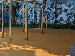Besonders auffällig ist die Kombination aus klassischem Calisthenics-Bereich und familienfreundlichen Elementen: Neben robusten Trainingsstationen gibt es auch kinderfreundliche Spiel- und Kletterbereiche, was den Park zu einem offenen, hellen Treffpunkt für Sport und Bewegung für alle Altersgruppen macht.