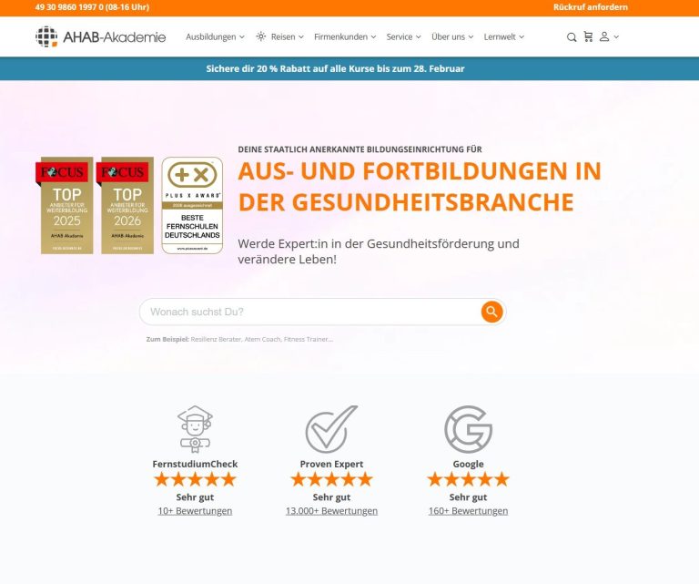 Die AHAB Akademie ist eine staatlich anerkannte Online-Akademie für Gesundheitsberufe. Seit 2004 qualifiziert sie Fachkräfte in den Bereichen Sport, Fitness, Stressbewältigung, Entspannung, Ernährung, Kindergesundheit, Gesundheitsberatung, Coaching, Gesundheitsförderung im Alter sowie Mitarbeiter- und Firmengesundheit. Ergänzt wird das Angebot durch Bildungs- und Gesundheitsreisen.